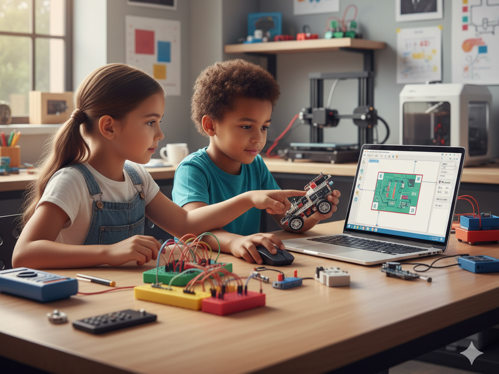 الدوائر الكهربائية وتصميمها, حيث يتعلم الطالب أساسيات هذا العلم من فهم المكونات والقطع الاساسية إلي تصميم دوائر بسيطة باستخدام محاكيات بصورة امنه و تفاعلية و شيقة مناسبة لسنه, تحت اشراف مباشر من مهندسين متخصصين و بمناهج STEM العالمية.